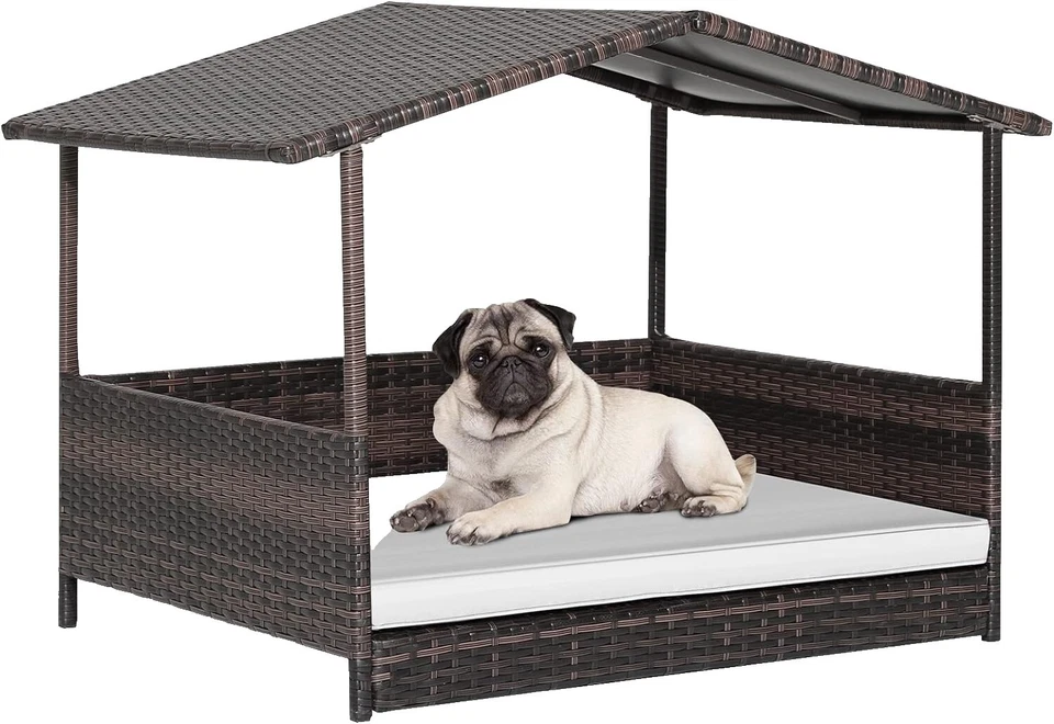 Casa de mimbre para perros, cama elevada de ratán para perros con techo impermeable, cojín lavable C